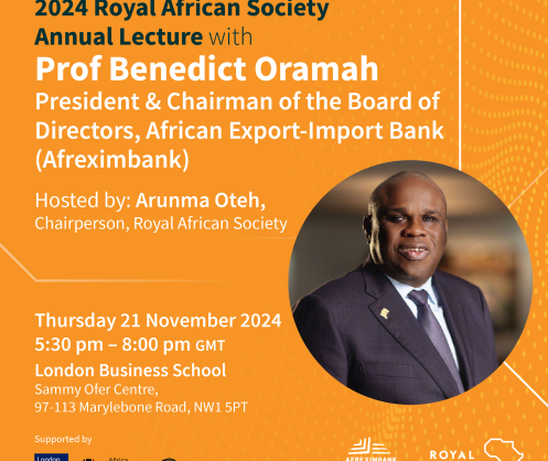The Royal African Society (https://RoyalAfricanSociety.org) is thrilled to announce that our Annual Lecture will be delivered by one of the most respected, transformative global leaders, Professor Benedict Oramah, President and Chairman of the Board of Directors at the African Export-Import Bank (Afreximbank), on Thursday, 21st November 2024, at the Sammy Ofer Centre, London Business School, 97-113 Marylebone Road, London NW1 5PT.